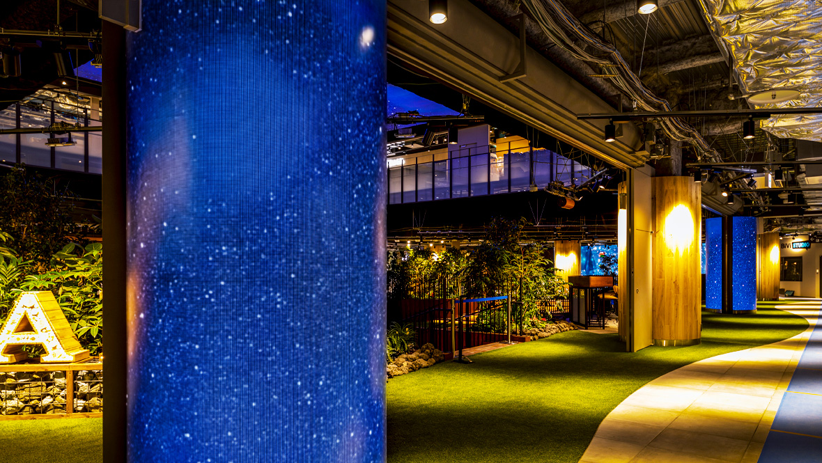流れる雲、エネルギーを感じる太陽、自然を感じる鳥の鳴き声。季節ごとの特徴を再現した美しい3DCGコンテンツと、その美しさを表現できる高品質なLEDビジョンにより再現されています。天井には16m四方の巨大なLED。さらに柱・壁面のLEDビジョンと連動し、「一つの大きな公園」に居るような心地の良い場所となっています。
